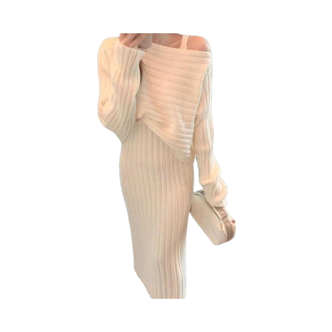 LYAART Women's Casual Two-Piece Outfits Long Sleeve Ribbed Knit Crop Top Bodycon Midi Dress Autumn Pullover Sweater Cami Front